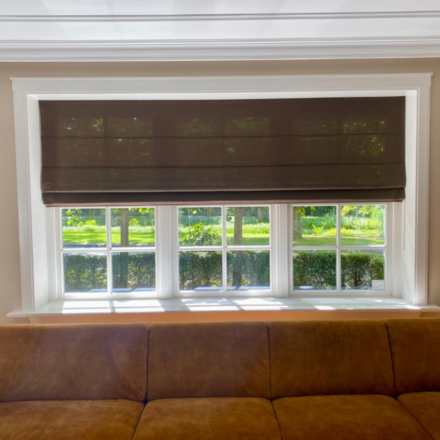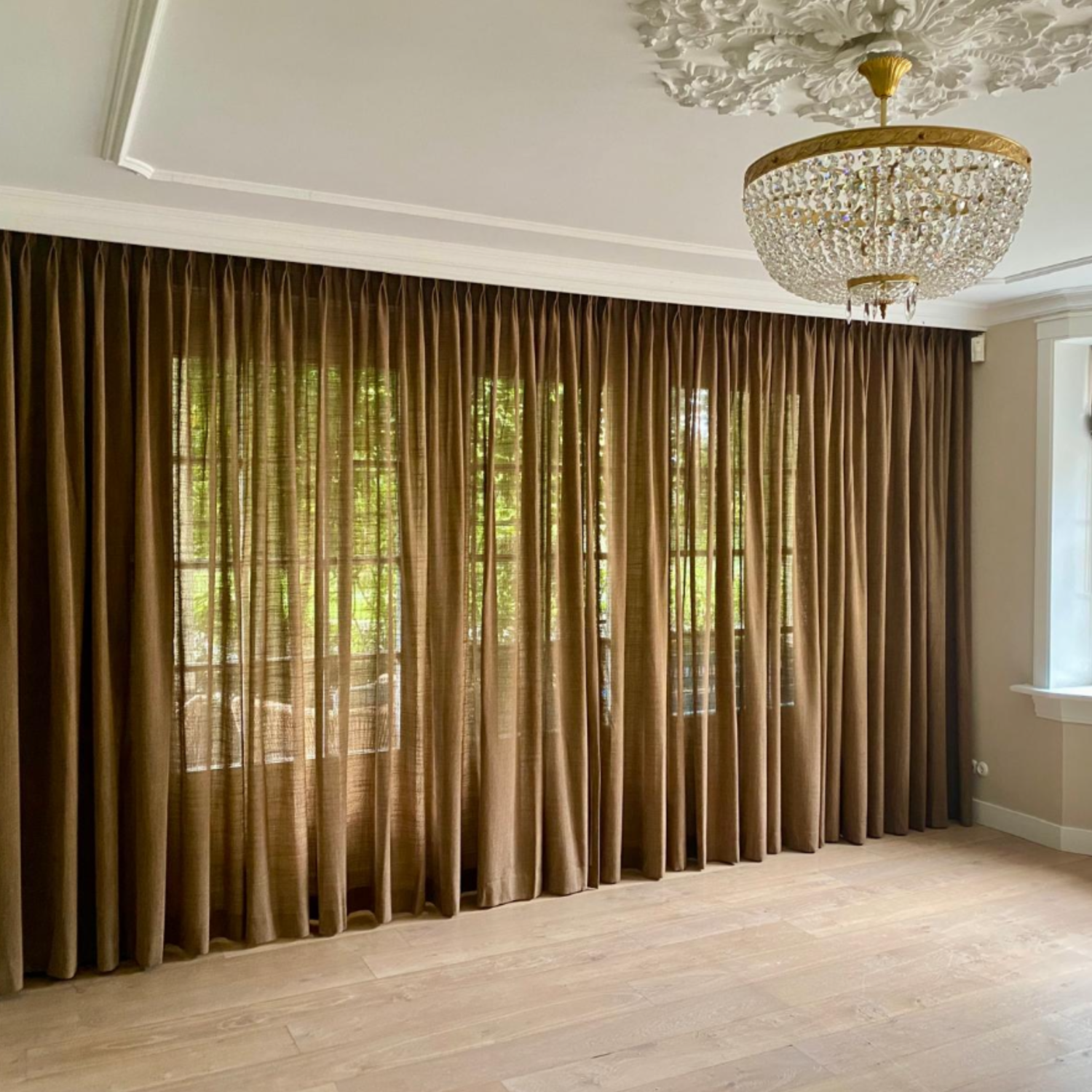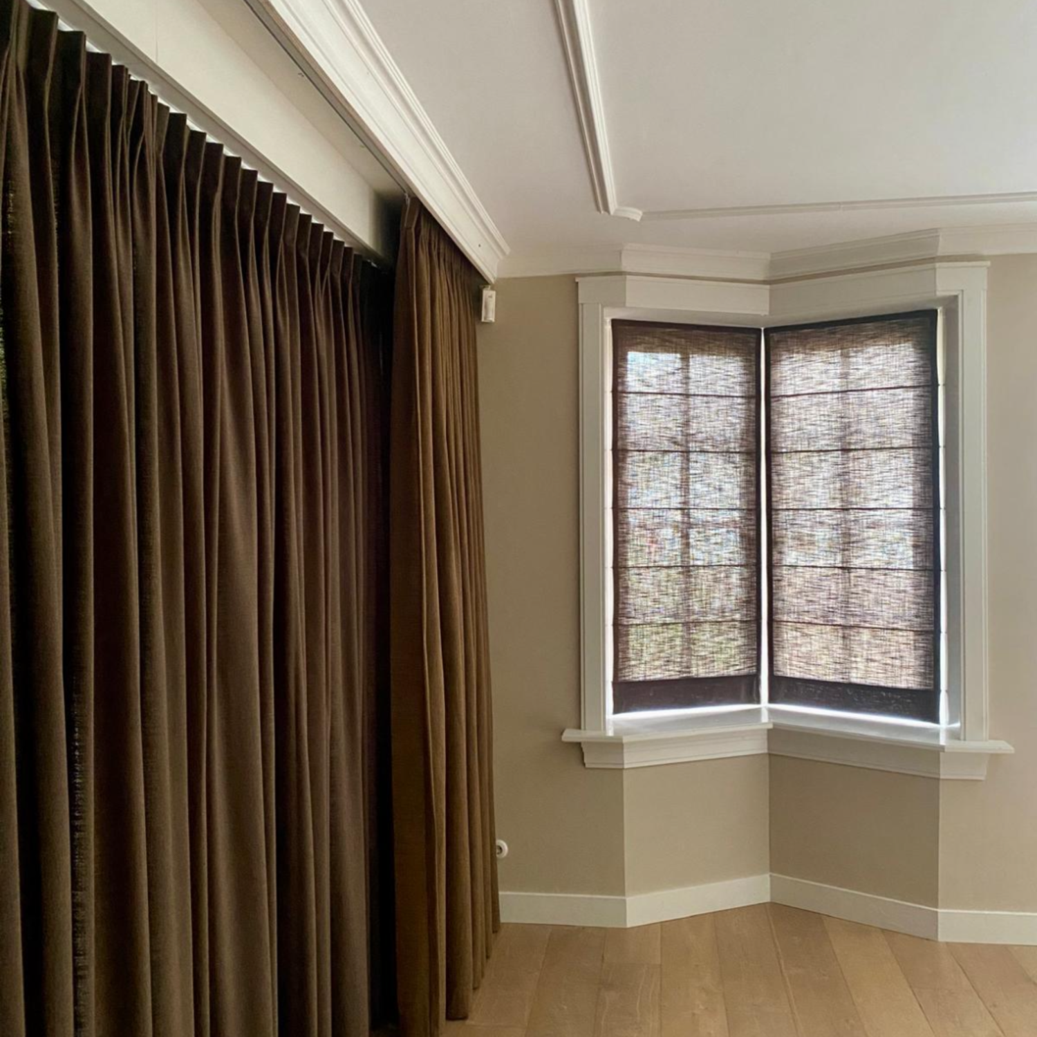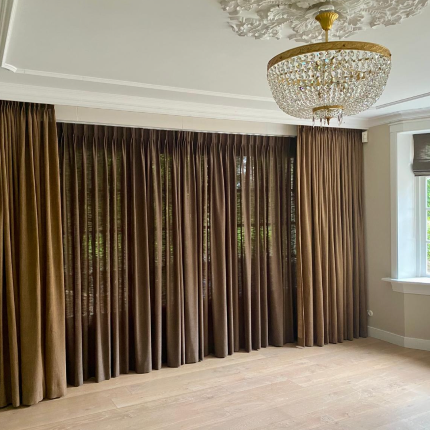 Wat dit project extra speciaal maakt, is de keuze om de inbetweens vóór de overgordijnen te hangen. Dit zorgt voor een unieke gelaagdheid en geeft een luchtig en stijlvol effect. Het gefilterde daglicht speelt prachtig met de transparantie van de stoffen, terwijl de overgordijnen op de achtergrond zorgen voor extra warmte en privacy.